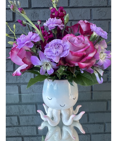 Send a hug with this octopus filled with lavender roses, beautiful dendrobium orchid blooms, fragrant stock and colorful miniature carnations.