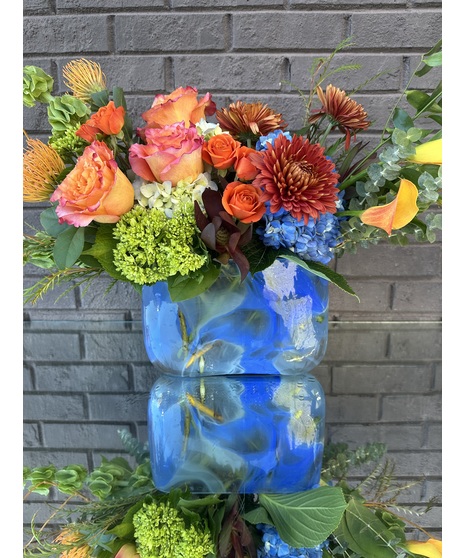 A burst of fall color meets coastal charm - this arrangement features rich autumn blooms in warm oranges and rust tones, beautifully complemented by a striking blue swirled vase that adds a touch of modern elegance.