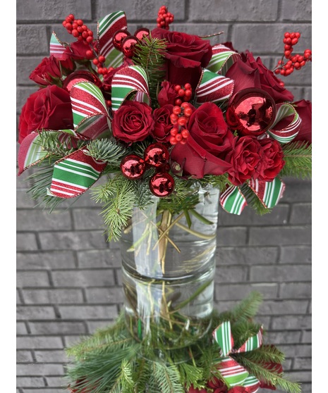 A beautiful holiday mix of red roses, red spray roses, ilex berries and evergreens. Accented with holiday ribbon and ornament accents.