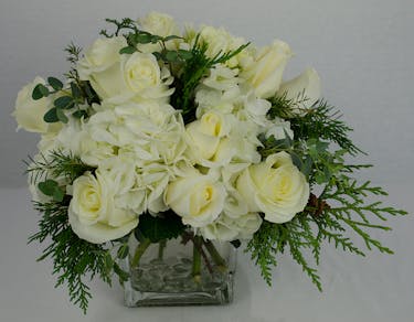 A winter wonderland arrangement of all-white hydrangeas and roses is accented with winter greenery in a clear glass cube.