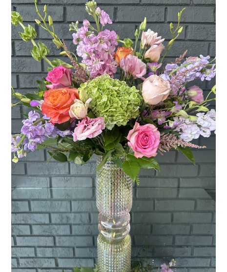This sweet pink textured vase is filled with beautiful roses, auqarella hydrangea, fragrant stock and dendrobium orchids. The perfect way to show them that they are your princess!