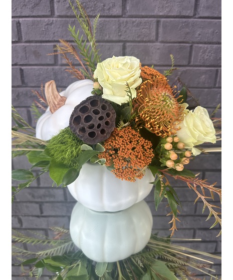 Pumpkin Season is here! Send an elegant presentation of white blooms with fall accents, including roses, lotus pods and protea in a white keepsake pumpkin.
