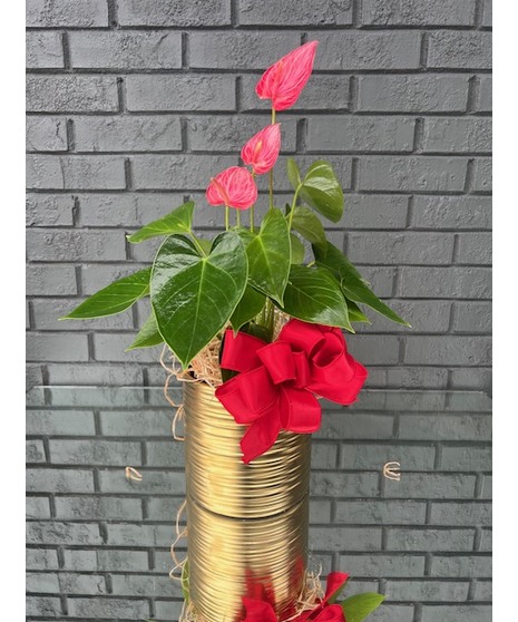 Glossy heart-shaped blooms are nestled in a chic ribbed gold container and finished with a classic red bow for an extra touch of romance!