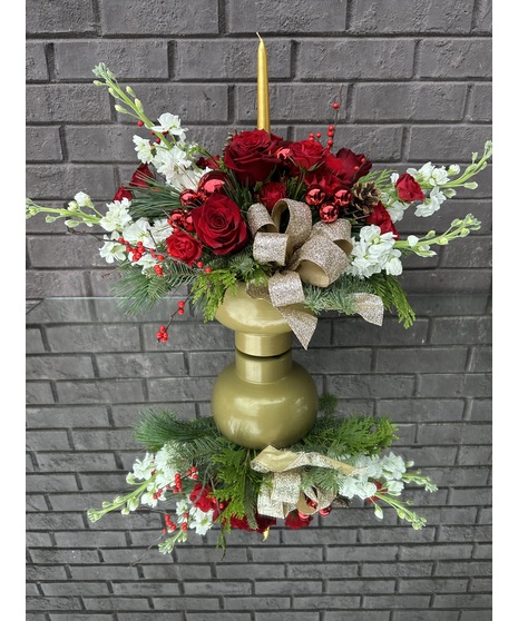 A festive holiday centerpiece featuring lush red roses, white stock and seasonal evergreens, all arranged around a single taper candles and finished with a shimmering holiday bow! Perfect for adding warmth and charm to any holiday table.