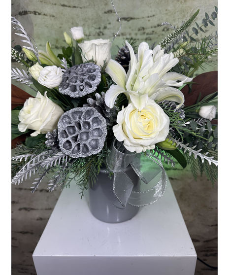 A perfect gift to bring to your Holiday dinner! A small statement centerpiece full of roses, bells of Ireland, lisianthus lotus pods, and accented with silver ribbon. Approx ( 14" H X 12 " W )